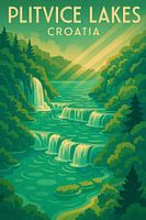 Dit kunstwerk is een eerbetoon aan de betoverende schoonheid van de Plitvicemeren in Kroatië, een natuurwonder dat bekend staat om zijn watervallen en smaragdgroene water. De scène is vormgegeven als een vintage Art Deco-reisposter en bestaat uit lagen watervallen omringd door weelderige groene bossen, verlicht door stralen van gouden licht. De levendige groene en turquoise tinten creëren een rustgevende maar opvallende compositie die levendig aanvoelt met beweging en energie.