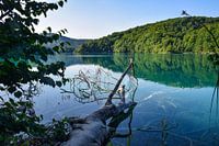 Boomstam op de oever van het Kozjakmeer in het Nationaal Park Plitvicemeren, Kroatië.