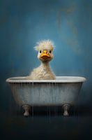 Een aandoenlijk eendje zit nieuwsgierig in een oude badkuip en lijkt klaar voor een plons. Het zachte, pluizige verenkleed steekt prachtig af tegen de blauwe achtergrond en de verweerde badkuip geeft het geheel een charmant, speels karakter. Een kunstwerk dat warmte en een glimlach in huis brengt.