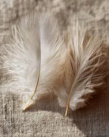 Op deze foto liggen twee lichte veren op een grof geweven linnen ondergrond. Het licht komt van rechts en werpt een warme gloed over de veren. De schaduwen zijn zacht en verlengen de contouren. De veren zijn verfijnd en buigen licht mee met de structuur van het doek.