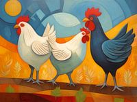 Drie gestileerde kippen staan tegen een levendige achtergrond van abstracte vormen en kleuren, waaronder blauw-, oranje- en geeltinten. Het tafereel ziet er helder en speels uit, waarbij de rode kammen en contrasterende veren van de kippen voor een levendige compositie zorgen.