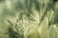 Tere druppels rusten als dauwjuwelen op de zaden van een paardenbloem, gevangen in het eerste ochtendlicht – als een sterrenhemel in miniatuur.
