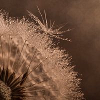 "Pluisje vertrekt uit de pluizenbol van een paardenbloem met druppeltjes" is een macrofoto van pluisjes op een paardenbloem met waterdruppeltjes, waarbij een pluisje heeft losgelaten.
