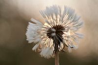 De pluizenbol van een paardenbloem met tegenlicht van de lage ochtend zon.