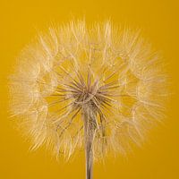 "Pluizenbol van een Tragopogon met gele achtergrond" is een macrofoto van een prachtige pluizenbol van een morgenster (Tragopogon).