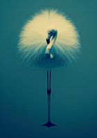 De flamingo staat op één been, wat kenmerkend is voor zijn natuurlijke houding, terwijl de dunne, lange poten in scherp contrast staan met de volumineuze, luchtige veren rondom zijn lichaam. De achtergrond, in een monochroom groenblauwe tint, versterkt de serene en surrealistische sfeer. De lichtinval benadrukt de details van de veren, waardoor ze lijken te gloeien tegen de donkere omgeving.