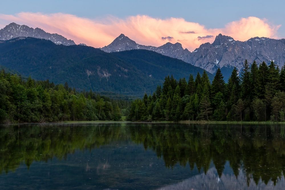 Pluizige roze wolken bij het stuwmeer