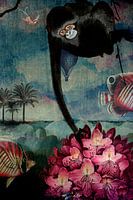 De aap van Ohara Koson plukt een rhododendron dat in de zee drijft. De vissen kijken toe terwijl er in de achtergrond een luchtballon voorbij zweeft. Vrij donker met lichte elementen in de lucht, dit werk heeft zowel iets speels als onheilspellends.