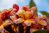 Fotografie van de zogenaamde Hawaï bloem - de Plumeria in klassiek oranje roze behoort tot de hondsgiffamilie (Apocynaceae).
