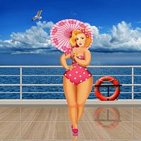 Sexy XL pin-up model bij verzending. Met paraplu voor de blauwe zee en lucht.