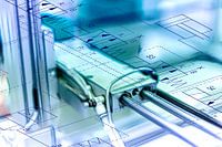 Pneumatische cilinder in een kunstzinnige bewerking, met er doorheen een pneumatisch schema.