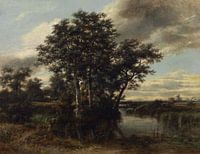 Landschap met een water naast bomen en een rund die in de poel staat.