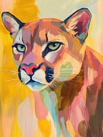 Poema Kunst - Dit kleurrijk dieren schilderij toont een groot, levendig portret van een poema in pastelkleuren, waarin de expressieve ogen en de markante snuit krachtig uitgelicht worden tegen een zonnige, gele achtergrond.