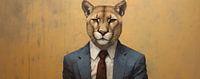 Poema in Pak - Voor je zie je een intrigerende fusie van dierenrijk en menselijke formaliteit, waarbij een majestueuze poema gekleed is in een strak blauw pak met stropdas. Het canvas wordt overheerst door warme okergele en aardse tonen die een rustieke achtergrond vormen en de poema's aanwezigheid accentueren.