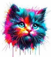 Een aquarel van een lief poesenkopje in felle neon kleuren gemaakt met A. I. art en digitaal bewerkt met Photoshop.