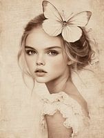 Dit kunstwerk is een combinatie van natuurlijke gratie en verfijnde elegantie. De delicate vleugels van de vlinder symboliseren vrijheid en lichtheid, terwijl het portret van het meisje een gevoel van tijdloze schoonheid oproept. Het subtiele kleurenpalet en de verfijnde details geven dit portret een serene, bijna dromerige sfeer. Ideaal voor liefhebbers van kunst die de harmonie tussen mens en natuur willen benadrukken."