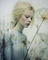 Poëtisch portret in matte pastelkleuren van een meisje in een bloemenveld tussen het fluitenkruid. Een prachtig werk voor aan je muur, mooi in ieder formaat!