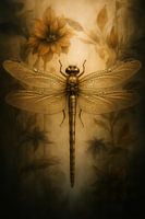 Deze gedetailleerde libel zweeft in het midden van een dromerige, botanische achtergrond met warme goudbruine tinten. Een beeld vol symmetrie, rust en cinematografische schoonheid dat de mysterieuze elegantie van de natuur vangt.