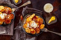 Foto van bovenaf geschoten van 2 borden met poffertjes op donkere borden op een donkere ondergrond met donkere linnen servetten, vorken, schaaltjes met roomboter en een biertje en ander drankje