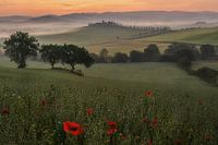 Wat is Toscana toch zo mooi op een lente ochtend: mooie rode klaprozen tussen de vochtige groen gewassen met op de achtergrond de opkomende zon dat de omgeving rond Poggio Covili geleidelijk doet ontwaken.