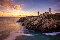 De Pointe de Saint Mathieu ligt op het uiterste westelijke punt van het Franse Bretagne in het departement Finistere. Op de punt staat de ruine van een oude abdij, een oude en een nieuwe vuurtoren. Hier zien we dit bij zonsondergang.