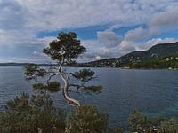 Landschap geschoten op Pointe du Layet bij het stadje Le Lavandou aan de Cote d'Azur in het zuiden van Frankrijk met een enkele kronkelboom op een bewolkte dag in de herfst.
