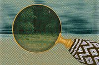 Fotografie, fotobewerking en collage van een loep en landschap.