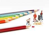 Miniturfiguren proberen een potlood aan te scherpen. Daarnaast moet natuurlijk de rommel opgeruimd worden. De werklui zijn daar in de achtergrond mee bezig met een bezem en een container. Deze minituurfiguren zijn slechts een ruime centimeter groot en worden normaal gesproken in de modelbouw gebruikt. Je vindt ze ook vaak terug bij modelspoorbanen.