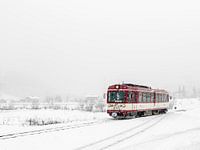 Polar Express: Rode boemel trein in een mistig winters landschap.
