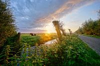 Vroege ochtend met koeien in het weiland, opkomende zon en prachtige wolken, met zicht op Leiden