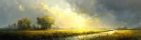 Polderlandschap | Serene Vistas - Dit landschapsschilderij toont een uitgestrekte polder, waarbij het zachte licht en de uitgebreide horizon samen een vredig tafereel creëren.