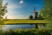 Een windmolen staat met z'n wieken in het licht van de ondergaande zon. Een deel van de molen wordt in het water van een sloot weerspiegeld.
