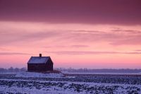 Polderlandschap in de sneeuw bij zonsopgang in Dordrecht, Zuid-Holland, Nederland. Een typisch Hollands Winterlandschap met een schuurtje op een terp in het eerste licht van de ochtend.