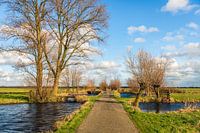Typisch Nederlands polderlandschap in de Krimpenerwaard bij het dorp Gouderak, provincie Zuid-Holland. De foto toont de Tiendweg op een zonnige dag in het winter seizoen. Er zijn witte wolken aan de strak blauwe hemel zichtbaar.