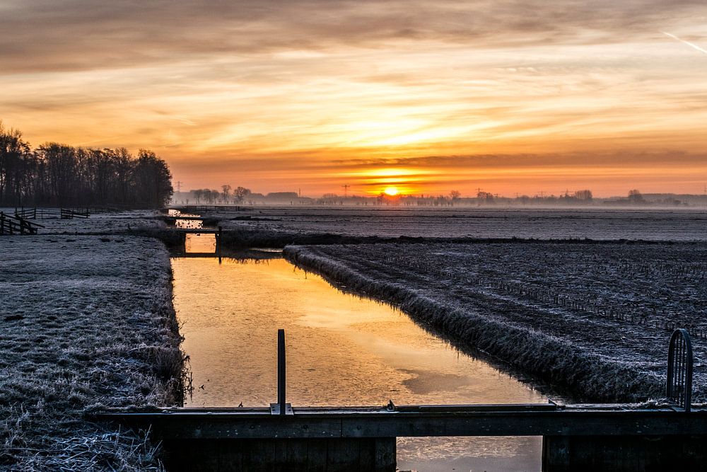 Polderlandschap met sloot dwars door het midden. Opgaande zon verdrijft de mist en laat een witte bevroren grond achter. Vleuten-De Meern (wel aan de andere kant van de rijksweg A12). Prachtig stukje langs de rijksweg A12 waar in de nabije toekomst een nieuwe wijk zal verrijzen zodra Leidsche Rijn is volgebouwd. De polder is vernoemd naar het voormalige Kasteel Rijnenburg.