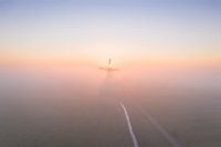Uitzicht op het gebied De Koningslaagte en de gelijknamige poldermolen ten Noordwesten van de stad Groningen. Deze foto is genomen tijdens een mistige zonsopkomst.