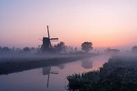 Het lijkt wel of de Westveense Molen kijkt hoe de zon straks boven de mist op gaat. De sloot op de voorgrond reflecteert de poldermolen. De foto is opgenomen in de Westveense Polder langs de Kromme Mijdrecht in de gemeente Nieuwkoop in Zuid-Holland.