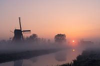 Het lijkt wel of de Westveense Molen kijkt hoe de zon boven de mist opkomt. De sloot op de voorgrond reflecteert de opgaande zon. De foto is opgenomen in de Westveense Polder in de gemeente Nieuwkoop in Zuid-Holland.