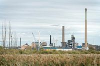 Kruibeke Belgium Nationaal Park Scheldevallei, Scheldt Valley National Park. View across the River from the Polders van Kruibeke to the Umicore refineries in Hoboken. Belgian, Flanders, Flemish, Vlaanderen, Vlaams, Countryside, Schelde en Durme-estuarium van de Nederlandse grens tot Gent , Nationaal Park Scheldevallei., contrast, chemical, plant, industrial, industry, riet, tidal, countryside, nature,