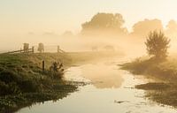 Polderloot met koeien die op de dijk lopen tijdens een mistige en rustgevende zonsopkomst in Holland.