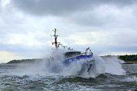 Patrouilleboot P6 van de Zeehavenpolitie Rotterdam onderweg naar zee bij Hoek van Holland op een stormachtige dag.