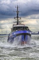 Politieboot P6 van de Zeehavenpolitie Rotterdam op weg naar zee op een stormachtige dag