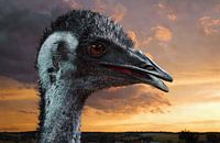 Portret van een Struisvogel in een landschap met ondergaande zon.