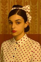 "Polka & Poetry" in een elegant vintage portret: witte blouse met rode stippen, bijpassende haarstrik, gouden neusring en een nostalgische behangachtergrond. Een plaatje tussen retro charme en moderne kracht.