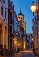 Deventer is een oude Hanzestad gelegen aan de IJssel rivier in Overijssel, Nederland. De stad heeft een lange historie en in de binnenstad bevinden zich nog veel pittoreske oude straatjes met sfeervolle avondverlichting. Hier zien we de Polstraat met uitzicht op de toren van de Lebuïnuskerk.