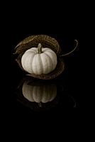 Een verfijnd stilleven van een witte pompoen omhuld door een blad, weergegeven tegen een diepe zwarte achtergrond. Het contrast en de reflectie zorgen voor een tijdloze, minimalistische uitstraling die perfect past in een modern interieur.