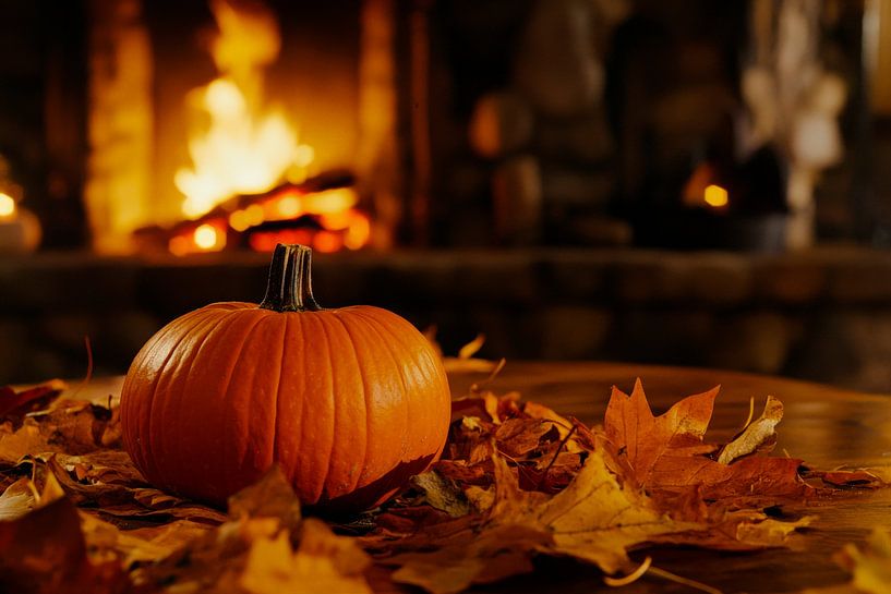 Koop de foto Pompoen en herfstbladeren bij de open haard van Poster Art Shop op canvas, aluminium dibond, (ingelijste) fotoprint, behang en ArtFrame, op maat geprint in Fine-Art kwaliteit.