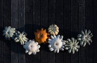Verschillende sierpompoenen liggen op een achtergrond van donker hout. Ze zijn van bovenaf gefotografeerd. Het lijkt alsof de pompoenen een tandwiel vormen dat met elkaar verbonden is.