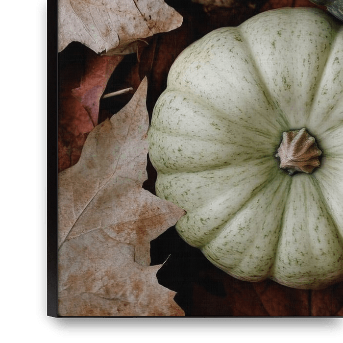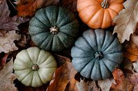 Een harmonieuze kleurensymfonie van diepgroene, blauwachtige, gouden en crèmekleurige pompoenen ontvouwt zich op een bed van herfstbladeren. Hun ronde vorm en natuurlijke texturen nodigen uit tot verwondering en belichamen de warmte van het oogstseizoen. Een eetbaar kunstwerk dat de zachte melancholie van de herfst weerspiegelt.