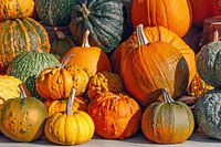 Pompoenen in allerlei vormen en mooie herfstkleuren in de middagzon.